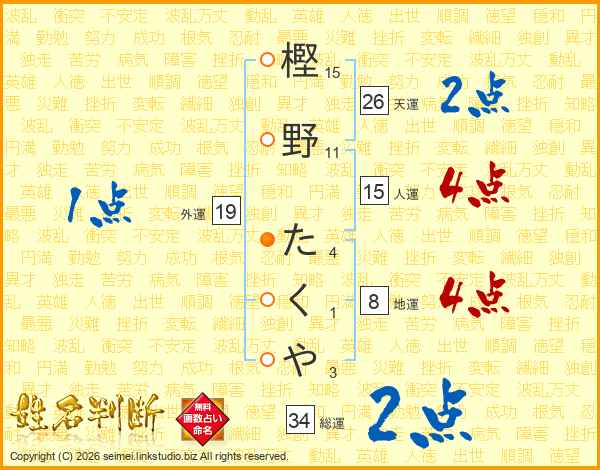 樫野たくやさんの天運は26画の2点!