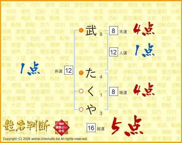 武たくやさんの総運は16画の5点!