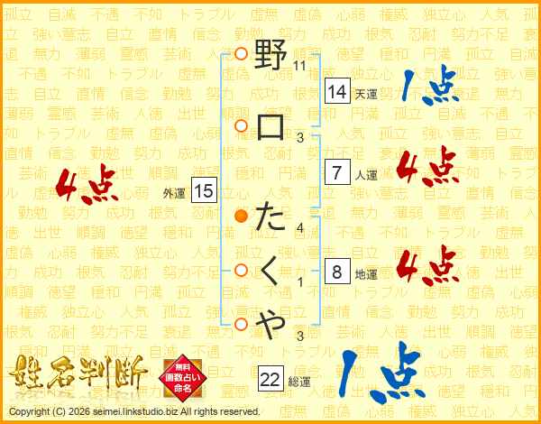 野口たくやさんの人運は7画の4点!