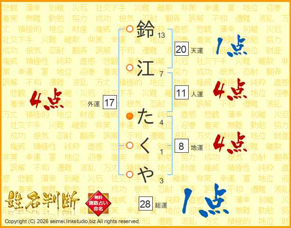 鈴(13画)江(7画) た(4画)く(1画)や(3画)