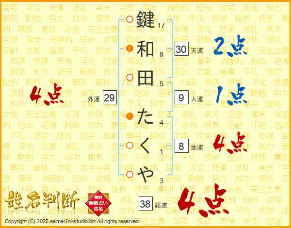 生活面を象徴する運勢です。外部から受ける影響力を表し、結婚運、家庭運や職場、環境への順応性を表します。総運から人運を引いた画数。姓や名が1文字の場合を除く。