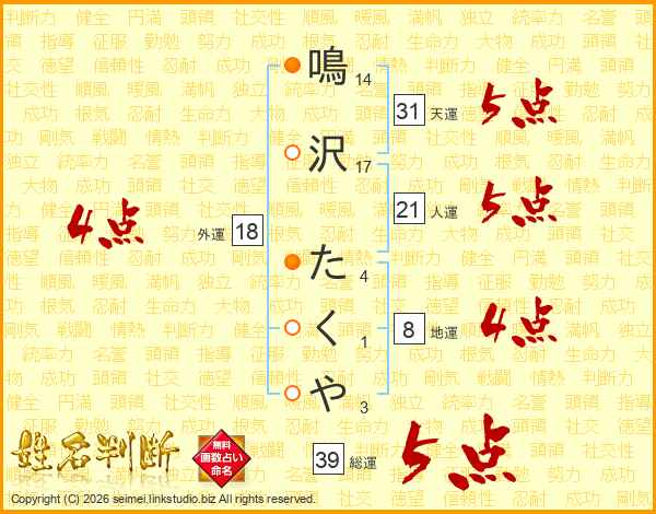 鳴沢たくやさんの総運は39画の5点!