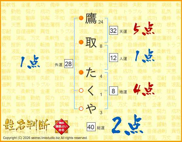 鷹取たくやさんの総運は40画の2点!