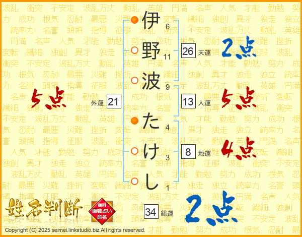 伊(6画)野(11画)波(9画) た(4画)け(3画)し(1画)