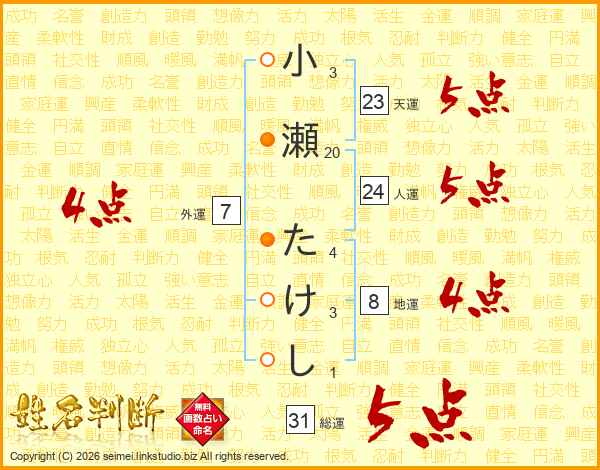 小瀬たけしさんの総運は31画の5点!