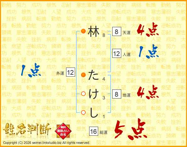 あなたの人生を表す1番重要な運勢です。生涯を通じて影響する総合運となり、主に50歳以降の晩年期に影響を及ぼします。苗字と名前の合計画数。
