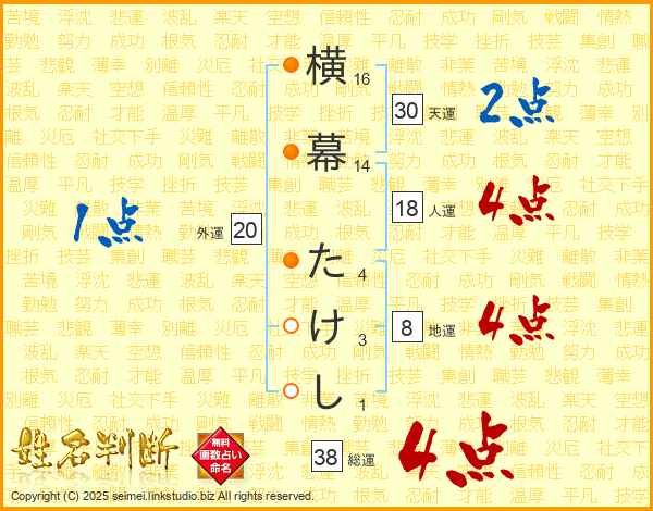 生活面を象徴する運勢です。外部から受ける影響力を表し、結婚運、家庭運や職場、環境への順応性を表します。総運から人運を引いた画数。姓や名が1文字の場合を除く。