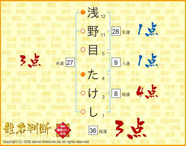浅野目たけしさんの総運は36画の3点!