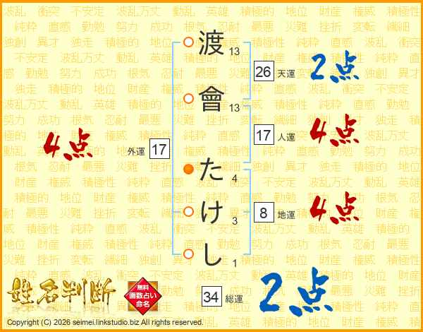 渡會たけしさんの天運は26画の2点!