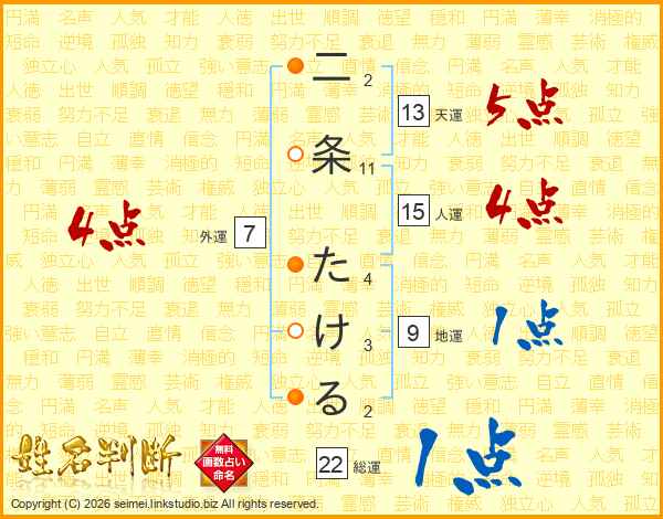あなたの人生を表す1番重要な運勢です。生涯を通じて影響する総合運となり、主に50歳以降の晩年期に影響を及ぼします。苗字と名前の合計画数。
