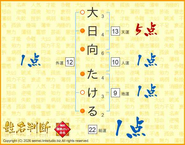 あなたの人生を表す1番重要な運勢です。生涯を通じて影響する総合運となり、主に50歳以降の晩年期に影響を及ぼします。苗字と名前の合計画数。
