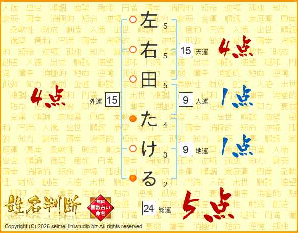 あなたの人生を表す1番重要な運勢です。生涯を通じて影響する総合運となり、主に50歳以降の晩年期に影響を及ぼします。苗字と名前の合計画数。