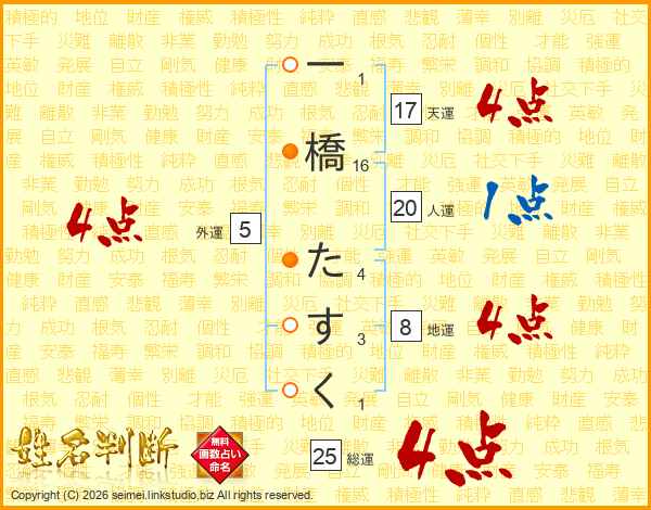 あなたの人生を表す1番重要な運勢です。生涯を通じて影響する総合運となり、主に50歳以降の晩年期に影響を及ぼします。苗字と名前の合計画数。