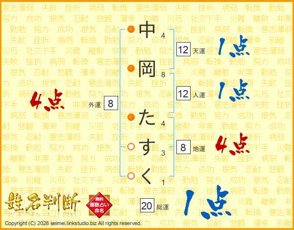 中(4画)岡(8画) た(4画)す(3画)く(1画)