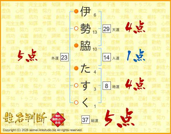 伊(6画)勢(13画)脇(10画) た(4画)す(3画)く(1画)
