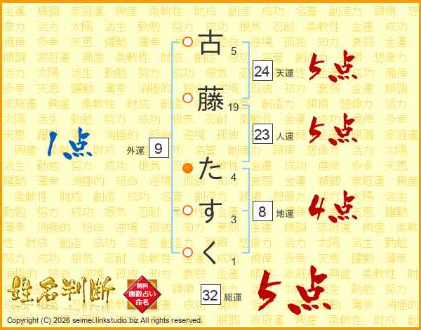 古(5画)藤(19画) た(4画)す(3画)く(1画)