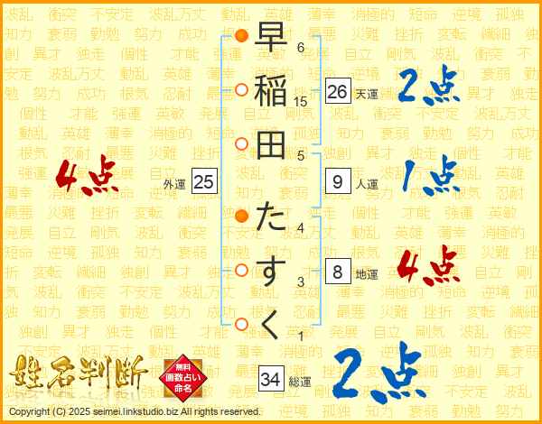 早(6画)稲(15画)田(5画) た(4画)す(3画)く(1画)