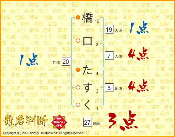橋口たすくさんの人運は7画の4点!