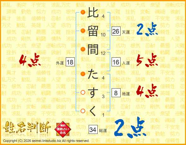 比(4画)留(10画)間(12画) た(4画)す(3画)く(1画)