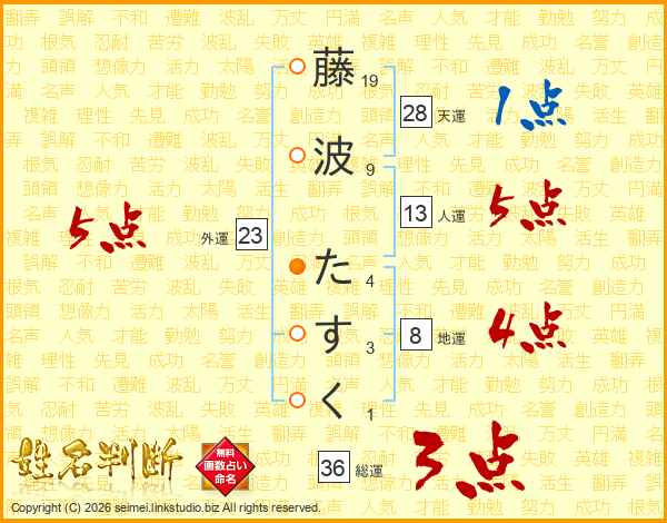 藤波たすくさんの人運は13画の5点!