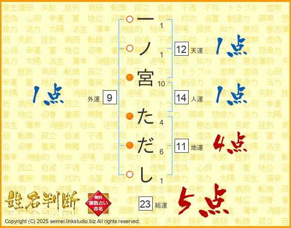 生活面を象徴する運勢です。外部から受ける影響力を表し、結婚運、家庭運や職場、環境への順応性を表します。総運から人運を引いた画数。姓や名が1文字の場合を除く。
