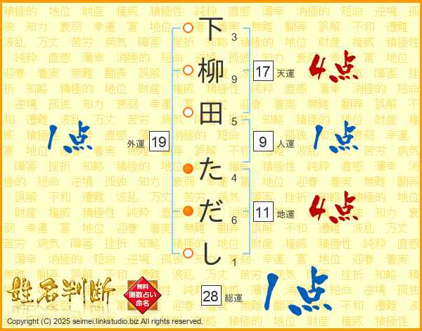 下(3画)柳(9画)田(5画) た(4画)だ(6画)し(1画)