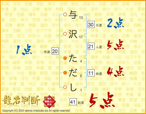 与沢ただしさんの総運は41画の5点!