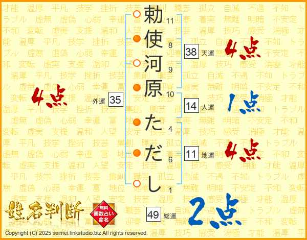 勅(11画)使(8画)河(9画)原(10画) た(4画)だ(6画)し(1画)