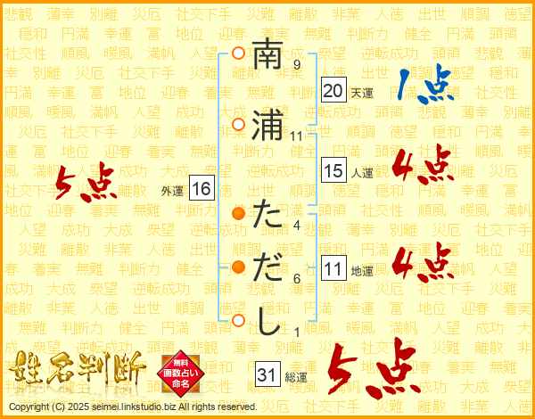 南(9画)浦(11画) た(4画)だ(6画)し(1画)
