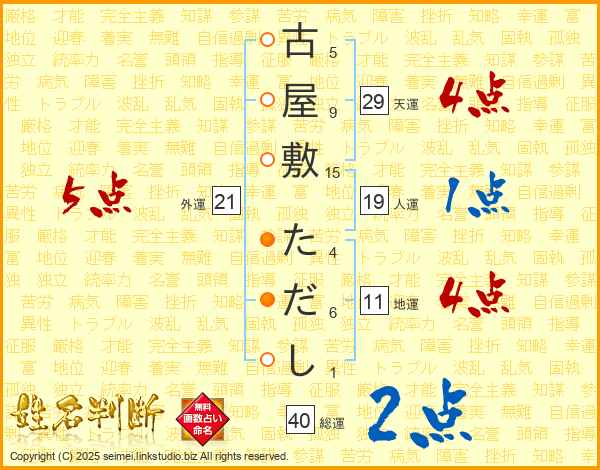 古(5画)屋(9画)敷(15画) た(4画)だ(6画)し(1画)