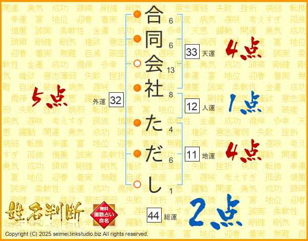 生活面を象徴する運勢です。外部から受ける影響力を表し、結婚運、家庭運や職場、環境への順応性を表します。総運から人運を引いた画数。姓や名が1文字の場合を除く。