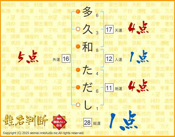 生活面を象徴する運勢です。外部から受ける影響力を表し、結婚運、家庭運や職場、環境への順応性を表します。総運から人運を引いた画数。姓や名が1文字の場合を除く。
