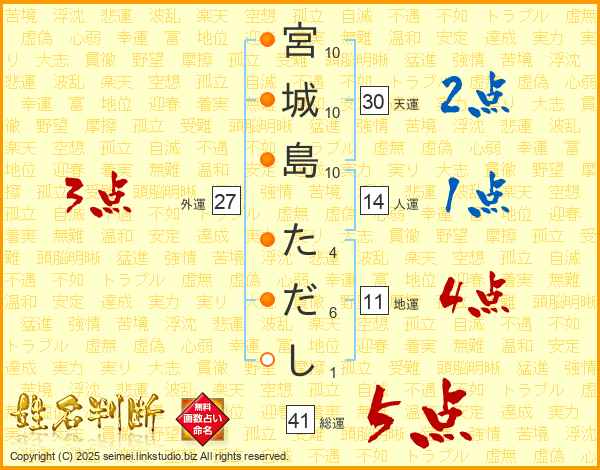 宮(10画)城(10画)島(10画) た(4画)だ(6画)し(1画)