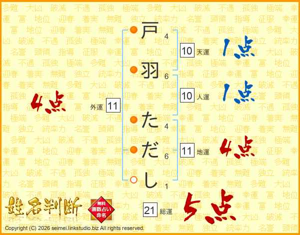 戸羽ただしさんの総運は21画の5点!