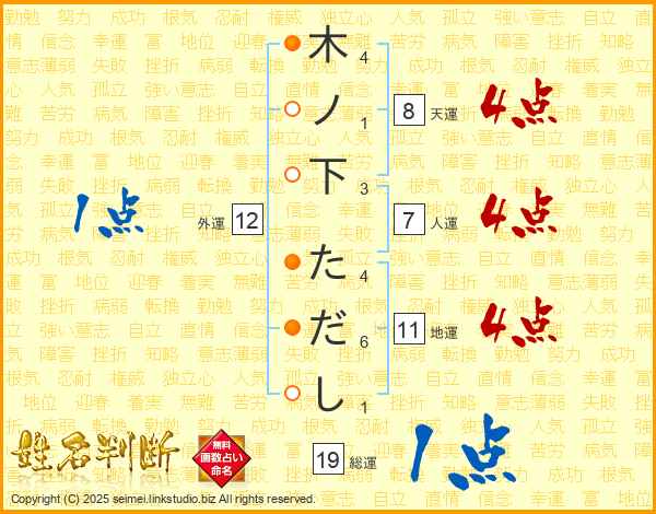 木(4画)ノ(1画)下(3画) た(4画)だ(6画)し(1画)
