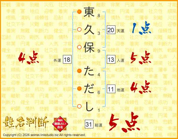 生活面を象徴する運勢です。外部から受ける影響力を表し、結婚運、家庭運や職場、環境への順応性を表します。総運から人運を引いた画数。姓や名が1文字の場合を除く。