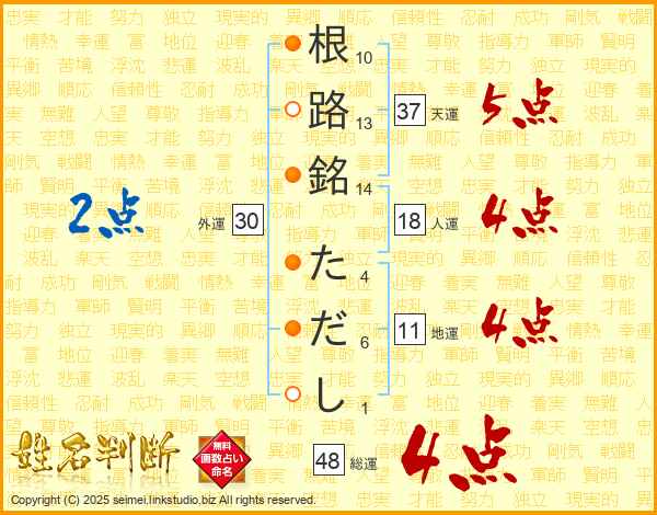 根(10画)路(13画)銘(14画) た(4画)だ(6画)し(1画)
