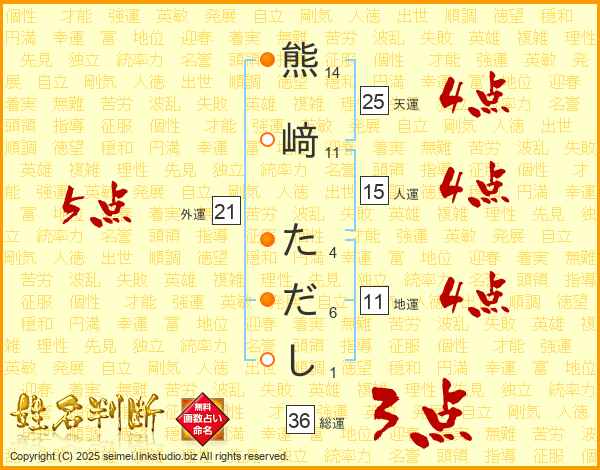 熊(14画)﨑(11画) た(4画)だ(6画)し(1画)
