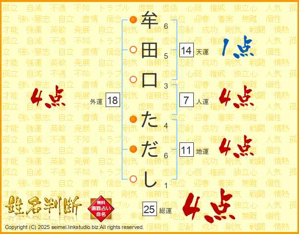 生活面を象徴する運勢です。外部から受ける影響力を表し、結婚運、家庭運や職場、環境への順応性を表します。総運から人運を引いた画数。姓や名が1文字の場合を除く。