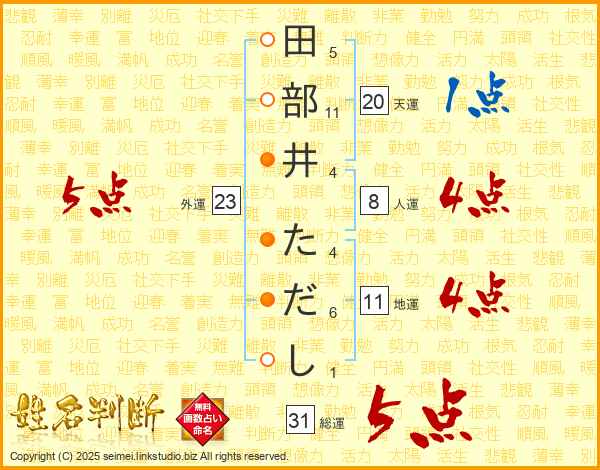 生活面を象徴する運勢です。外部から受ける影響力を表し、結婚運、家庭運や職場、環境への順応性を表します。総運から人運を引いた画数。姓や名が1文字の場合を除く。