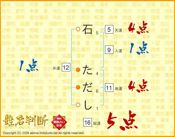 生活面を象徴する運勢です。外部から受ける影響力を表し、結婚運、家庭運や職場、環境への順応性を表します。総運から人運を引いた画数。姓や名が1文字の場合を除く。