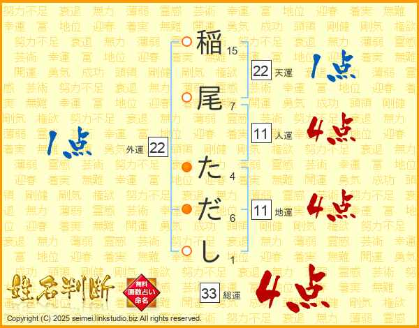 稲(15画)尾(7画) た(4画)だ(6画)し(1画)
