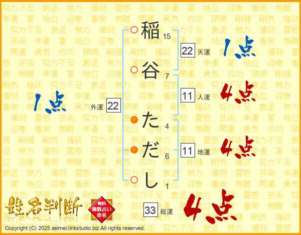 稲(15画)谷(7画) た(4画)だ(6画)し(1画)