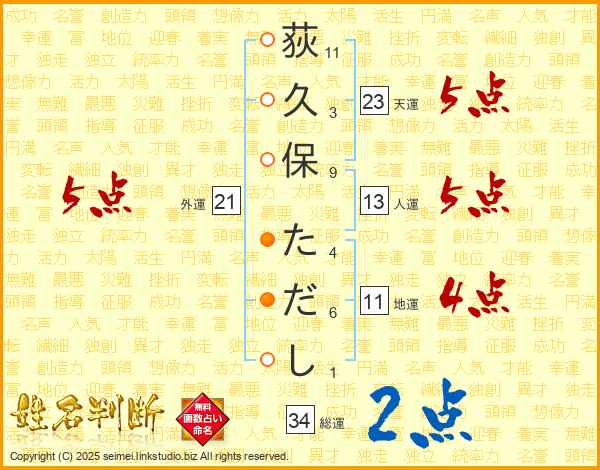 荻(11画)久(3画)保(9画) た(4画)だ(6画)し(1画)