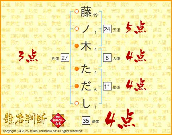 藤(19画)ノ(1画)木(4画) た(4画)だ(6画)し(1画)