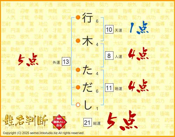 あなたの人生を表す1番重要な運勢です。生涯を通じて影響する総合運となり、主に50歳以降の晩年期に影響を及ぼします。苗字と名前の合計画数。