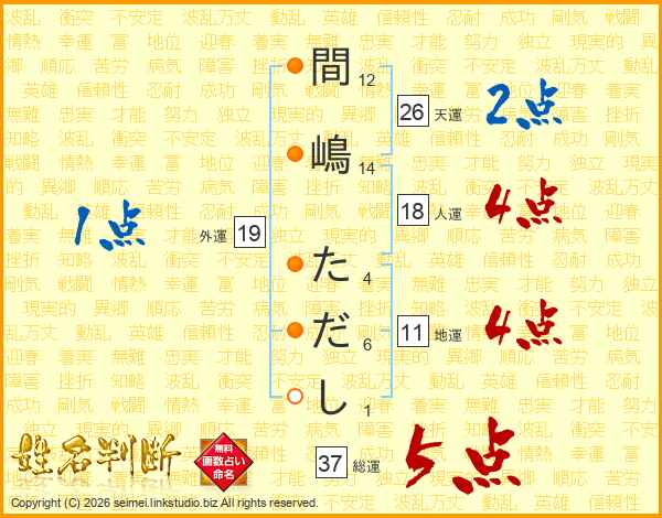 間嶋ただしさんの総運は37画の5点!