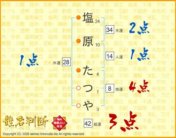 塩(24画)原(10画) た(4画)つ(1画)や(3画)