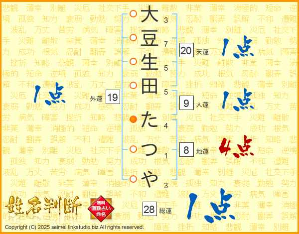 大豆生田たつやさんの総運は28画の1点!