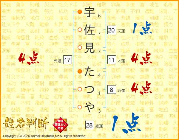 宇(6画)佐(7画)見(7画) た(4画)つ(1画)や(3画)
